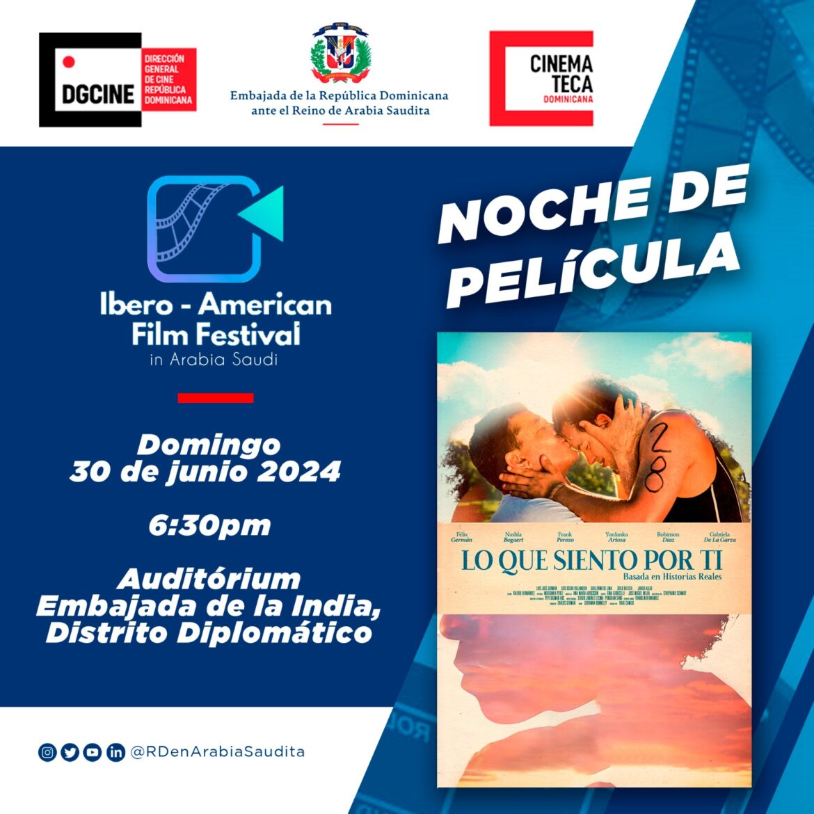 Riad.-La Embajada de la República Dominicana ante el Reino de Arabia Saudita informó la inauguración del “3er. Festival de Cine Iberoamericano” en esa nación árabe, prevista el 23 de junio, donde el país debutará en este evento cinematográfico con el emotivo filme “Lo que siento por ti”, ópera prima del director Raúl Camilo.
