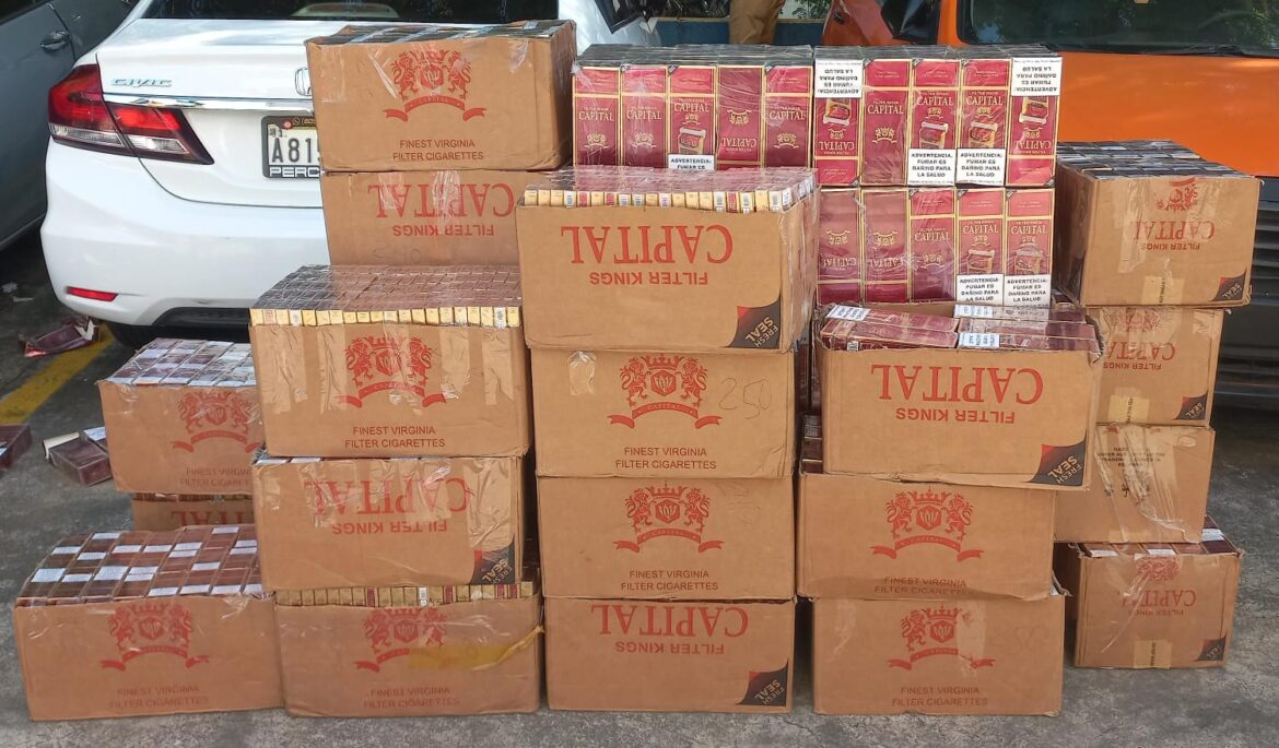 Durante el operativo, realizado frente a su residencia, las autoridades incautaron 60 cajas que contenían un total de 8,069 cajetillas de cigarrillos, lo que equivale a 161,380 unidades.