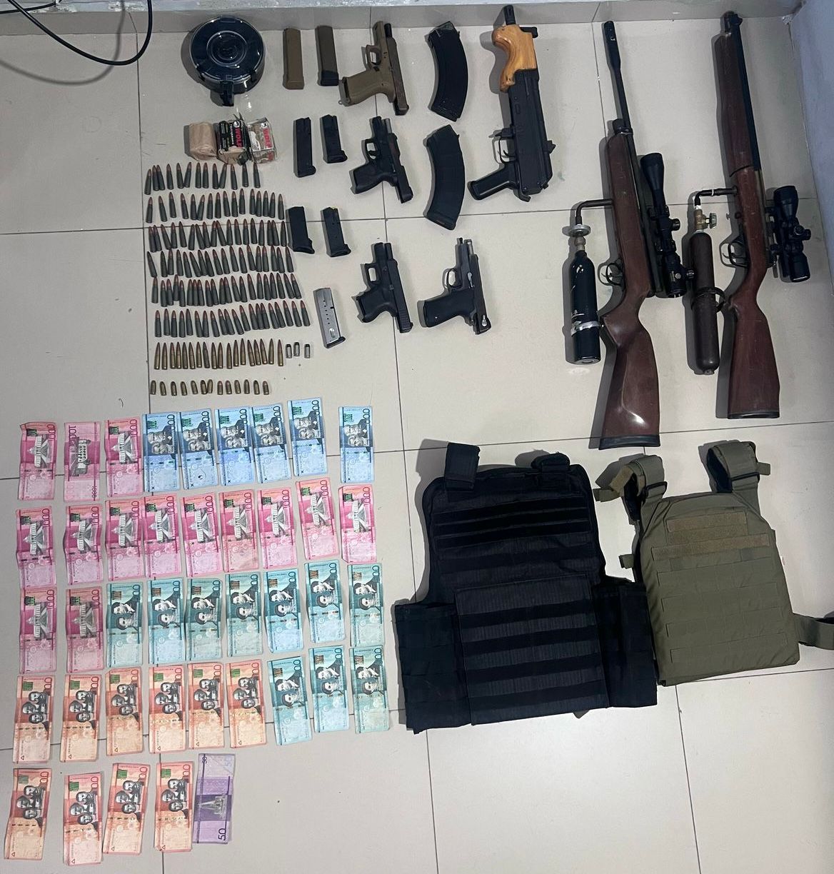 Durante la intervención fueron ocupados un fusil calibre 7.62mm, una escopeta calibre 12, cinco pistolas calibre 9mm, una pistola calibre .380, dos rifles de aire comprimido, dos chalecos antibalas, 167 municiones calibre 7.62mm, 18 municiones calibre 5.7mm, 16 municiones calibre 9mm y la suma de 32,050 pesos en efectivo.