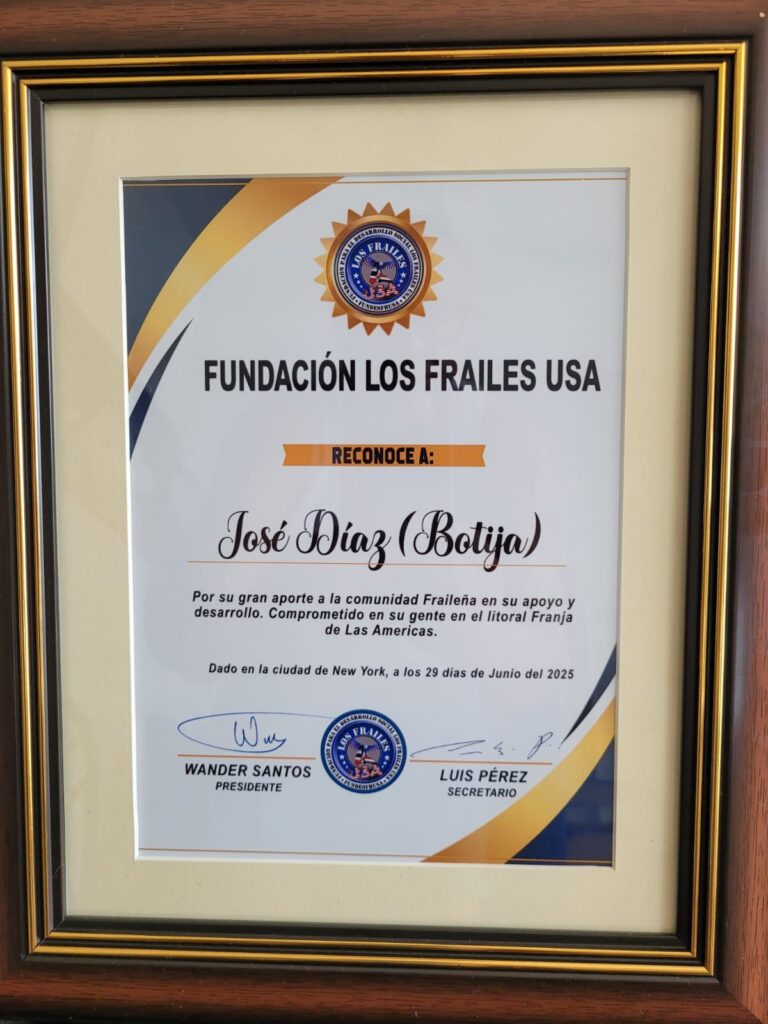 Nueva York. –La Fundación Los Frailes USA entregó un reconocimiento especial a José Díaz, conocido como “Botija”, por su valioso aporte al desarrollo de la comunidad fraileña y su dedicación a las causas sociales en el litoral Franja de Las Américas.