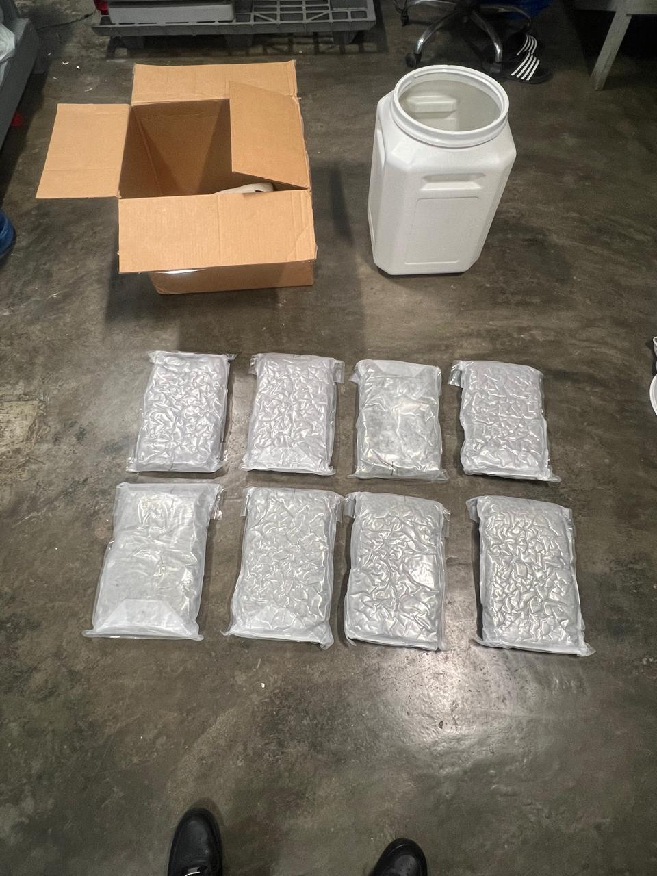 Por instrucciones del fiscal actuante, se procedió a abrir el recipiente, localizando en su interior, un total de ocho paquetes de marihuana, empacados en fundas de color blanco, con un peso aproximado a las 10 libras.